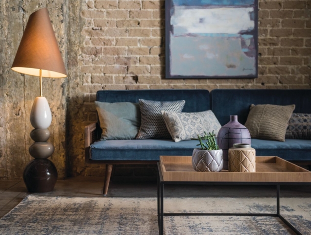 ספת נורמן עושה כבוד לספות הוינטג’ האהובות. בסיס הספה עשוי מעץ מנגו בעל דפנות שתי וערב, בעוד הריפוד הקטיפתי מגיע בשני גוונים - אפור וצהוב. שולחן סלון הייז - משטח עליון מעץ אלון ובסיס ברזל. מנורת אורית - בסיס קרמיקה דמוי חלוקי נחל