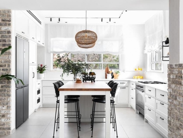 גוף תאורה תלוי העשוי מקש ראטן בצבע לבן, המשולב עם דוגמא גיאומטרית שחורה, היוצרת קונטרסט ועניין. קש הראטן מכניס נגיעה טרנדית לעיצוב, מבלי להשתלט על החלל.