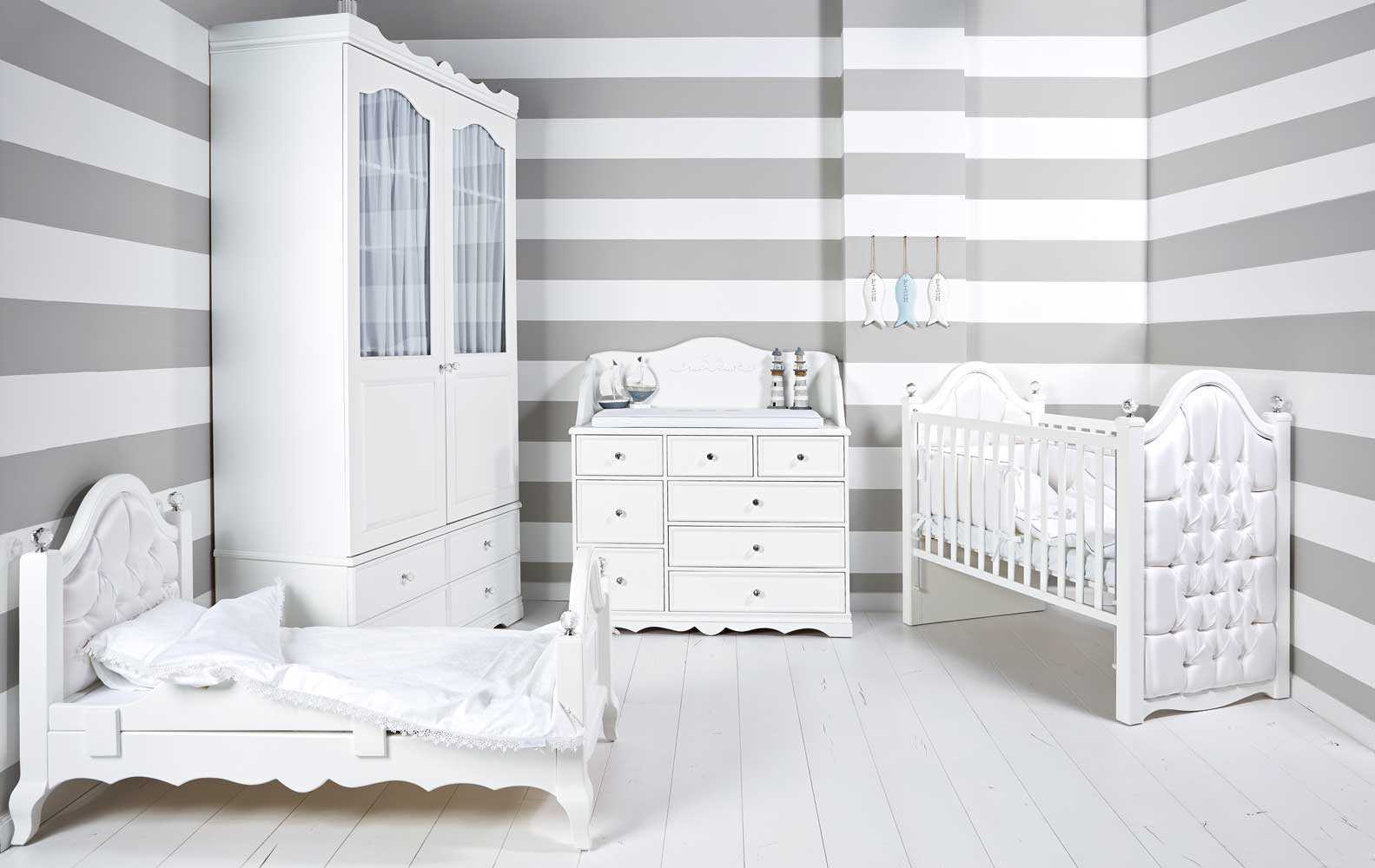 חדר מעוצב בסגנון פרובנס. מיטת תינוק ומיטת מעבר מעוצבות במראה רומנטי עם גב ראש קפיטונאז’ ( ניתן לעצב גב ראש חלק), ארון מפואר בעל 2 דלתות רחבות בשילוב זכוכית חלקה ווילון למראה רך ועשיר, הכולל: תלייה, מדפים ו-4 מגירות. הריהוט עשוי מחומרים טבעיים בלבד של עץ מלא בשילוב אורן פיני, קרוליינה וליבנה וצבעים על בסיס מים ללא כימיקלים רעילים. כל הדגמים ניתנים להזמנה בתאמה אישית. להשיג: תמיר קידס, הקומה העליונה