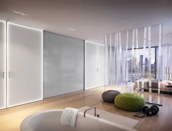 ארון הזזה יוקרתי בגימור זכוכית, הנפרש לאורך הקיר עם תאורה היקפית